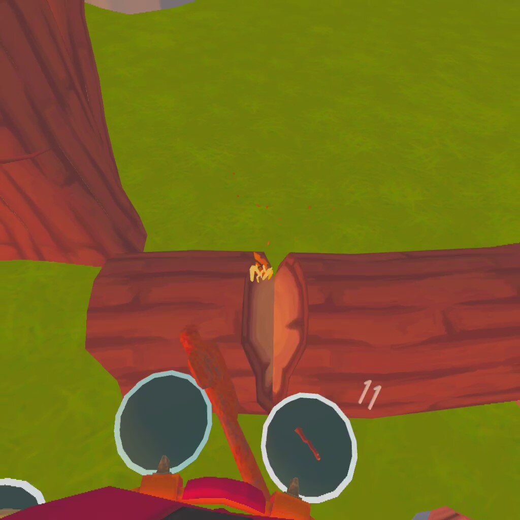 A nearby sign helpfully states that you only need grass and sticks to make this backpack. Luckily there are a lot of both just outside of the building. It also states that you will need to hammer in some nails. Hopefully you can figure out that nails are automatically added and that you need a rock to hammer them in. At first you just add pieces, sticks and grass. When you pick up the right piece, where it should go is highlighted, but you don’t know what order they go on it. A lot of trial and error ensues. Maybe you notice when a nail should be hammered in before you can add the next piece, maybe you spend ten minutes trying to add the next piece before noticing that you needed to hammer in a nail before going forward. Maybe you figure out that the sticks in the frame need to go in before the grass does. Well you either figure it out yourself, or you take off your VR headset and turn to the internet for someone to show you exactly how its done. Also, hammering is hard. Just like chopping wood, there’s a knack to getting it just right, and sometimes when you hit a nail it seems like it should go in further and it doesn’t.