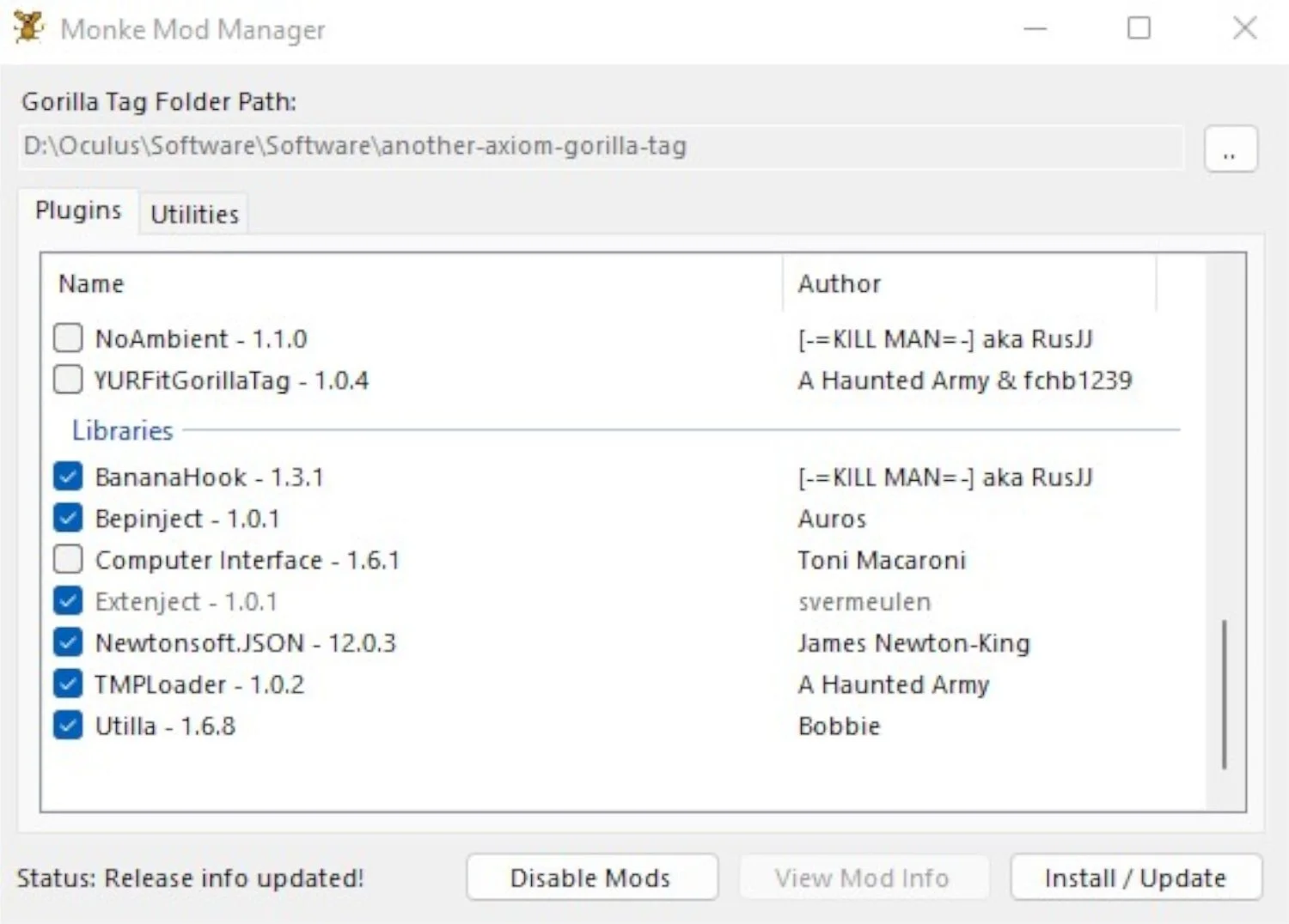 Whether Monke Mod Manager found the path automatically or you had to find it yourself, it will start up and you’ll see a menu with a bunch of check boxes. Scroll down to the very bottom and check the boxes “BananaHook”, “Bepinject”, “Newtonsoft”, “TMPLoader”, and “Utilla".